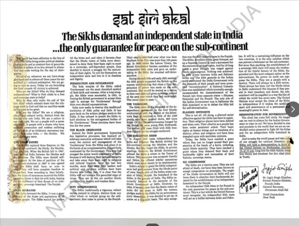 अक्तूबर 1971 की एक ठंडी पतझड़ की सुबह, द न्यूयॉर्क टाइम्स के हलचल भरे न्यूजरूम में एक ऐड था, जिसे बहुत कम अमेरिकी समझ पाए। इसे विदेश में रहने वाले, एक कम जाने-पहचाने भारतीय नेता, जगजीत सिंह चौहान ने दिया था, जो पंजाब प्रांत का पूर्व वित्त मंत्री था। भारत में लोकल चुनाव हारने के बाद, उसके मन में न्यूयॉर्क टाइम्स में एक ऐड देने का आइडिया आया, जिसमें ‘खालिस्तान’ नाम का एक अलग सिख देश बनाने की मांग की गई थी।