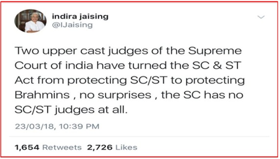 23 मार्च 2018 के ट्वीट में इंदिरा जयसिंह ने सुप्रीम कोर्ट के दो “उच्च जाति” के न्यायाधीशों पर आरोप लगाया कि उन्होंने SC/ST (अत्याचार निवारण) अधिनियम को दलितों की बजाय ब्राह्मणों के संरक्षण के लिए कमजोर किया।