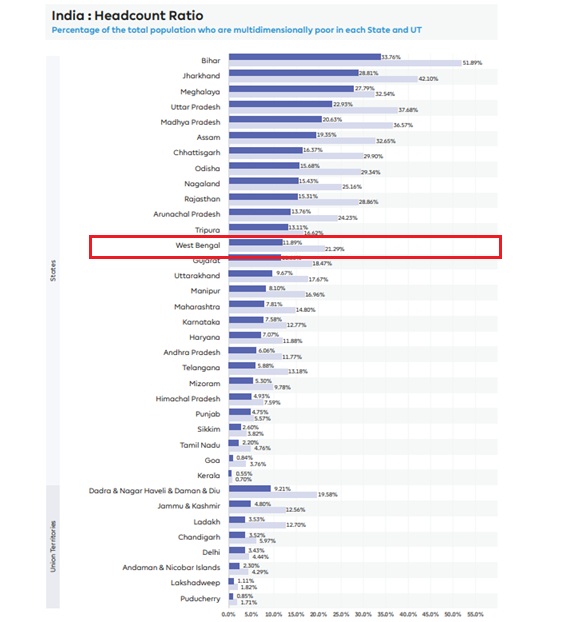 नीति आयोग की मल्टीडायमेंशनल पॉवर्टी 2023 की रिपोर्ट के अनुसार पश्चिम बंगाल में गरीबी की स्थिती गंभीर है। रिपोर्ट के अनुसार वहां रहने वाले लगभग 9 करोड़ लोगों में से 11 प्रतिशत लोग अभी भी मल्टीडायमेंशनल गरीबी का शिकार हैं। इसका सीधा मतलब है कि उन्हें समाज की मुख्य धारा में लाने के लिए जन कल्याणकारी योजनाओं की जरूरत है।